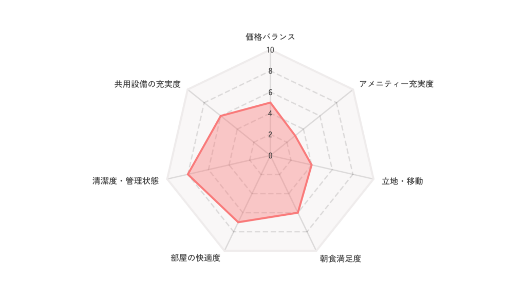 ※ 本記事の評価は 「出張利用(仕事+回復)」を前提に10点満点で採点し、総合を5点換算しています。